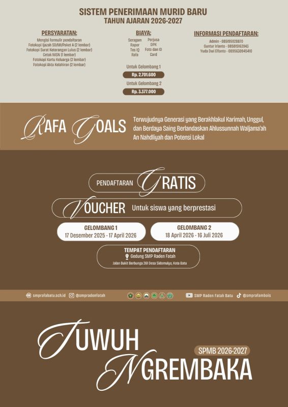 SMP Raden Fatah Batu - SMP Raden Fatah Batu resmi membuka sistem pendaftaran murid baru (SPMB) tahun ajaran 2026-2027. Tahun ini kami memilih tema “Tuwuh Ngrembaka” (Tumbuh Berkembang) sebagai pengingat dan harapan. Bahwa kami ingin terus belajar, berbenah, dan berproses menjadi lebih baik dari waktu ke waktu.Dimulai dari gelombang pertama yang dilaksanakan pada tanggal 17 Desember 2025 sampai 17 April 2026. Sedangkan untuk gelombang kedua dimulai pada tanggal 18 April 2026 sampai 16 Juli 2026.